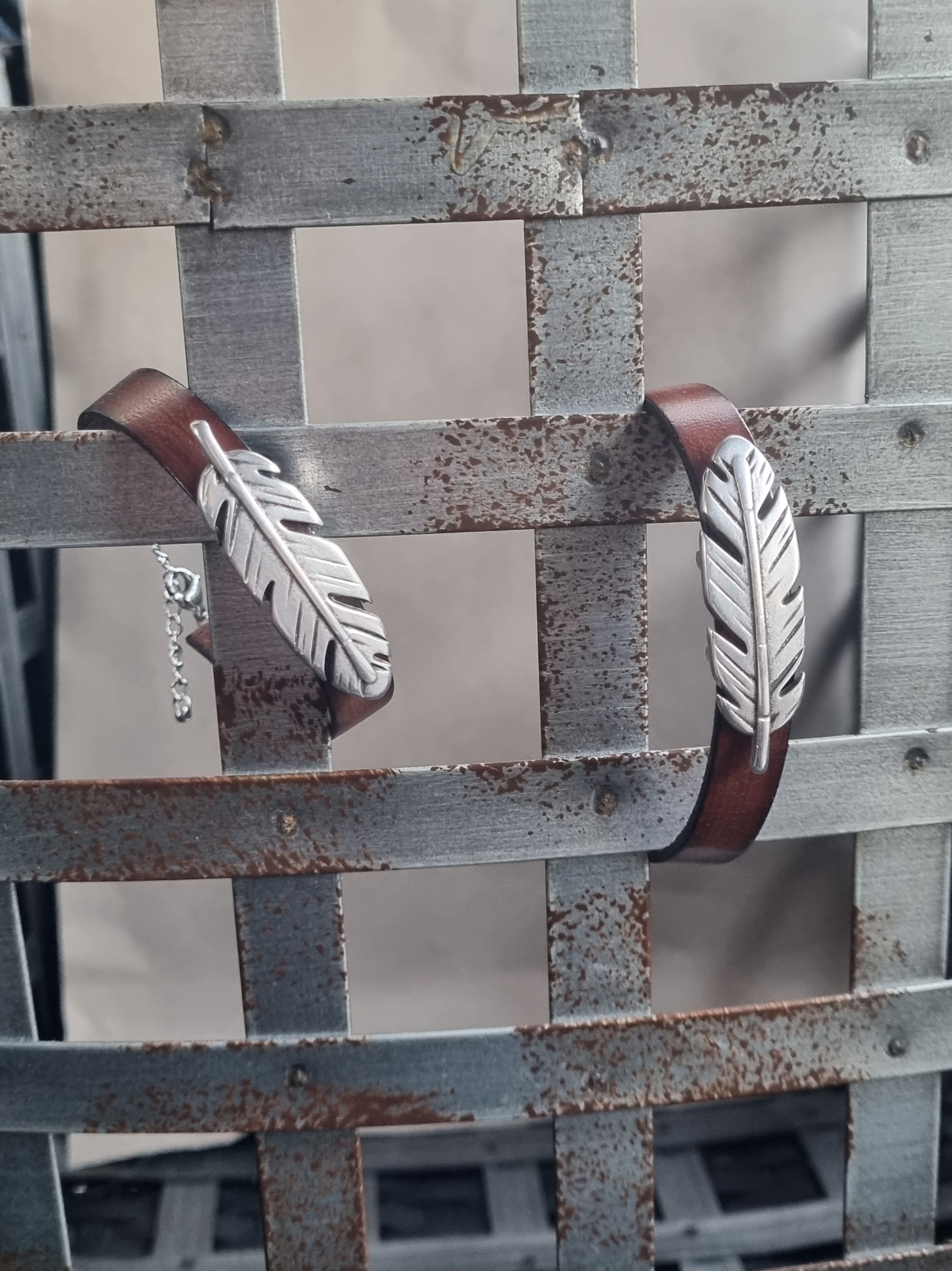 Äkta läder, lås och kedja i kirurgiskt stål. Berlock formad som ett löv -i europeisk kvalitetsmetall.