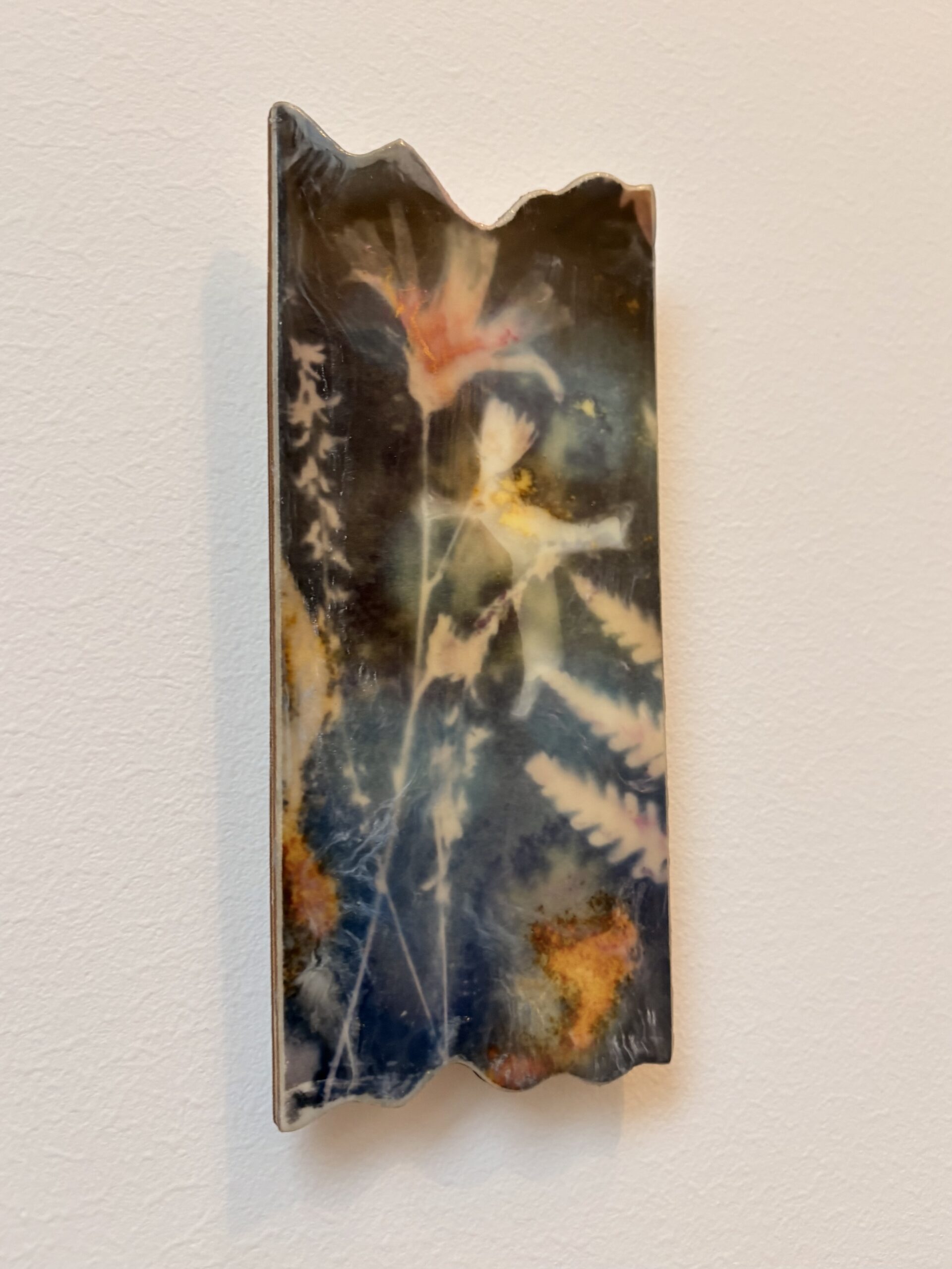 Blandteknisk fotoencaustic med ett fotocollage som kombinerar ett digitalt fotografi och en cyanotypi, tryckt på Hahnemühle Hemp arkivbeständigt papper, monterat på trä och bearbetat med bivax och PanPastels.