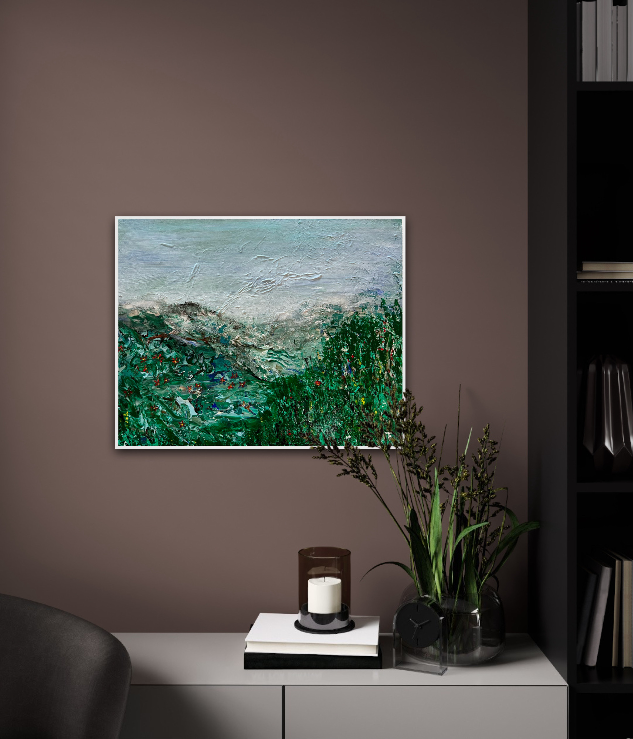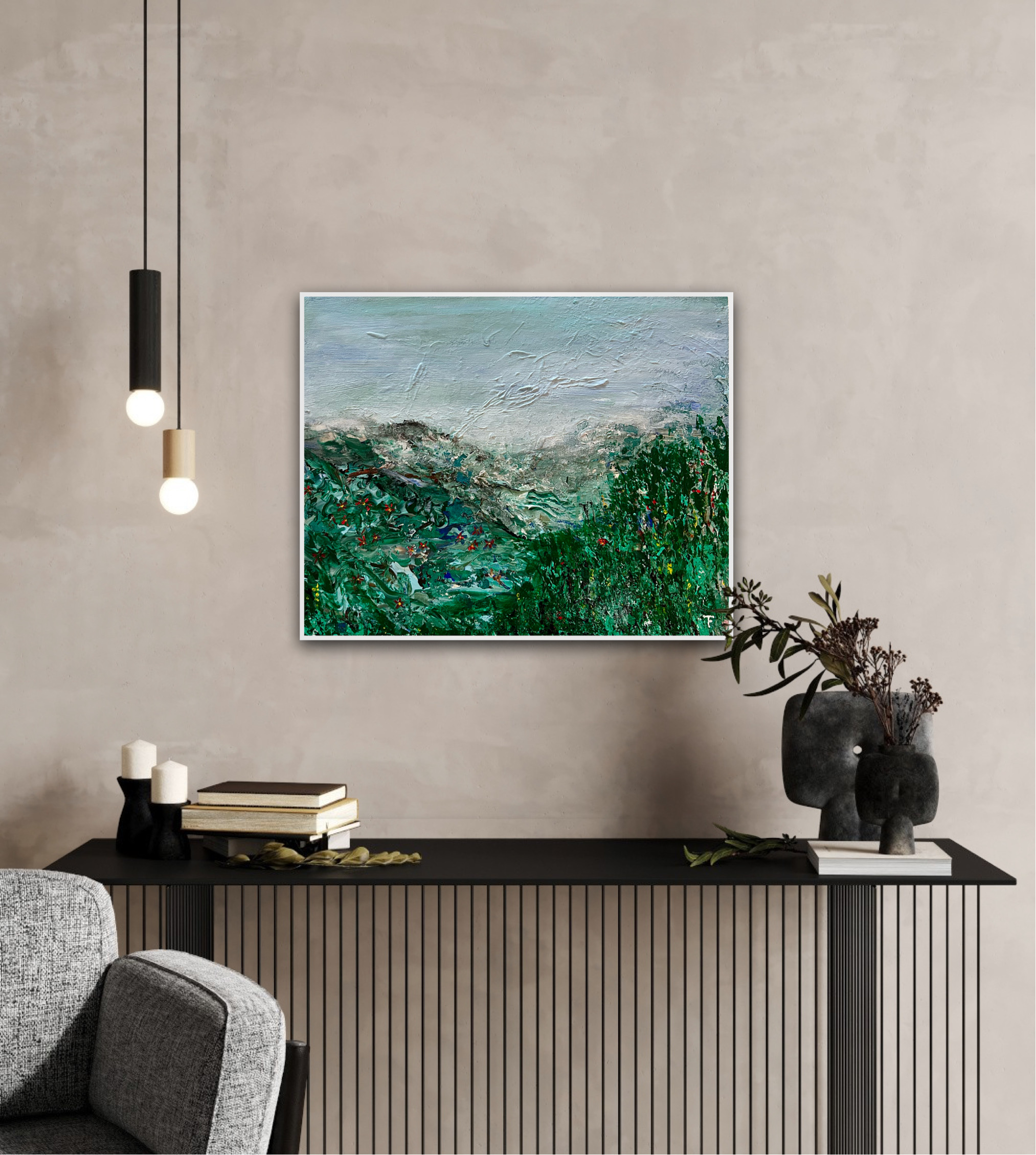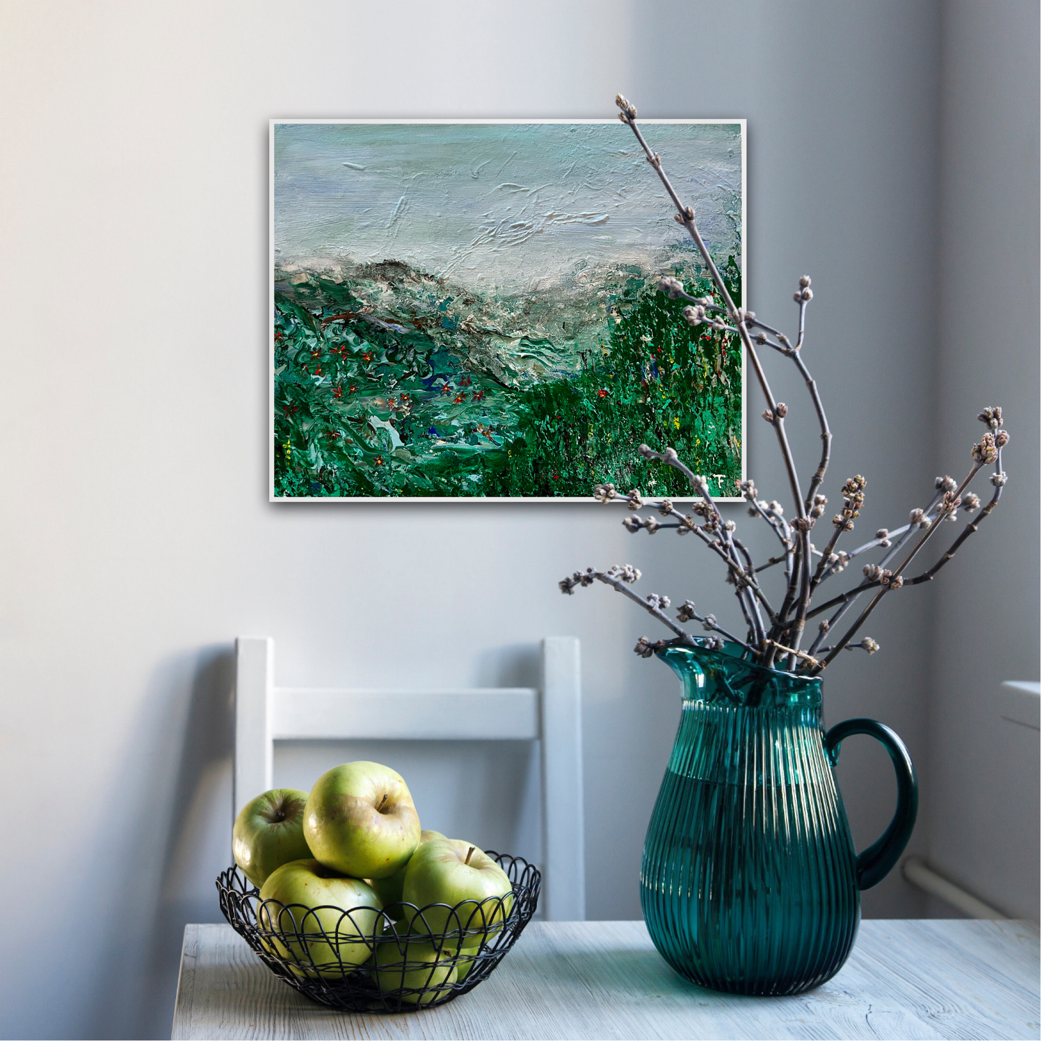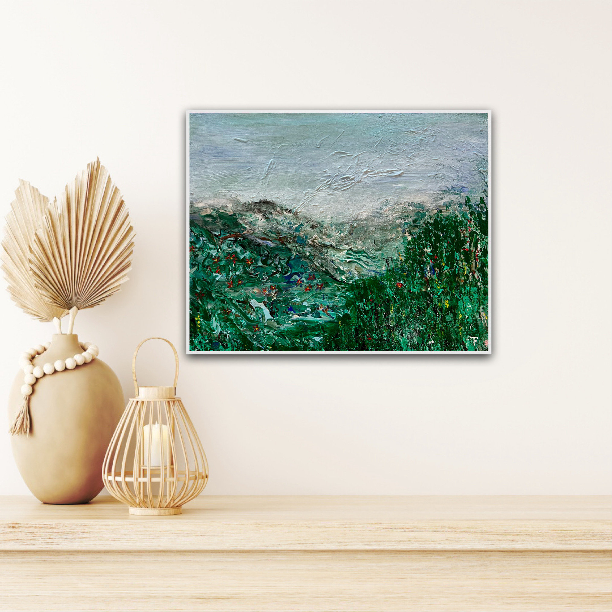 Landscape with structure in green, original acrylic painting on deep edge canvas, 40×50 cm. White painted edges.
