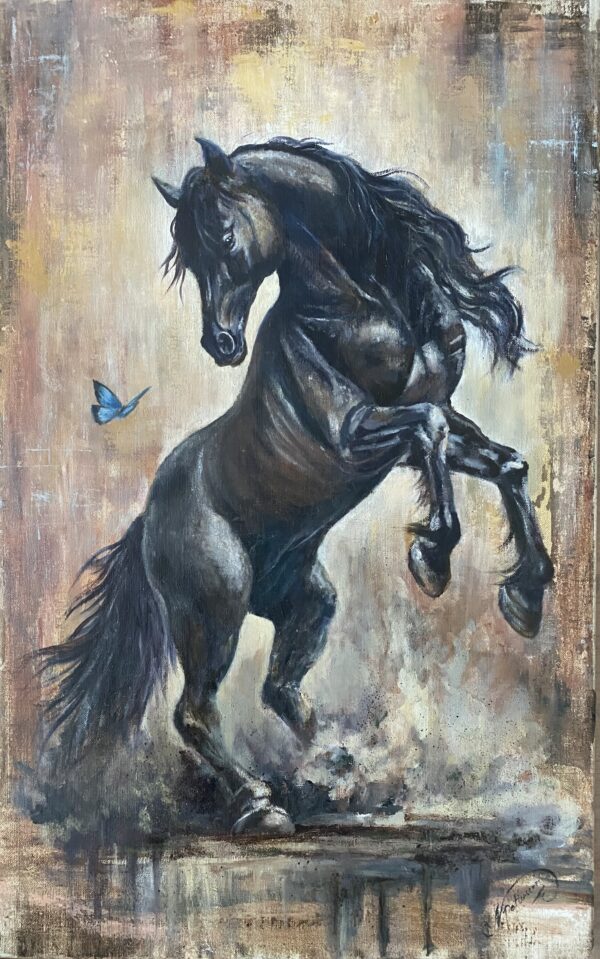 “Fire and Soul”) is a painting that explores the intense relationship between passion and inner calm. The artwork captures the moment when the movement of dance transforms into a stream of energy—both burning and life-giving.