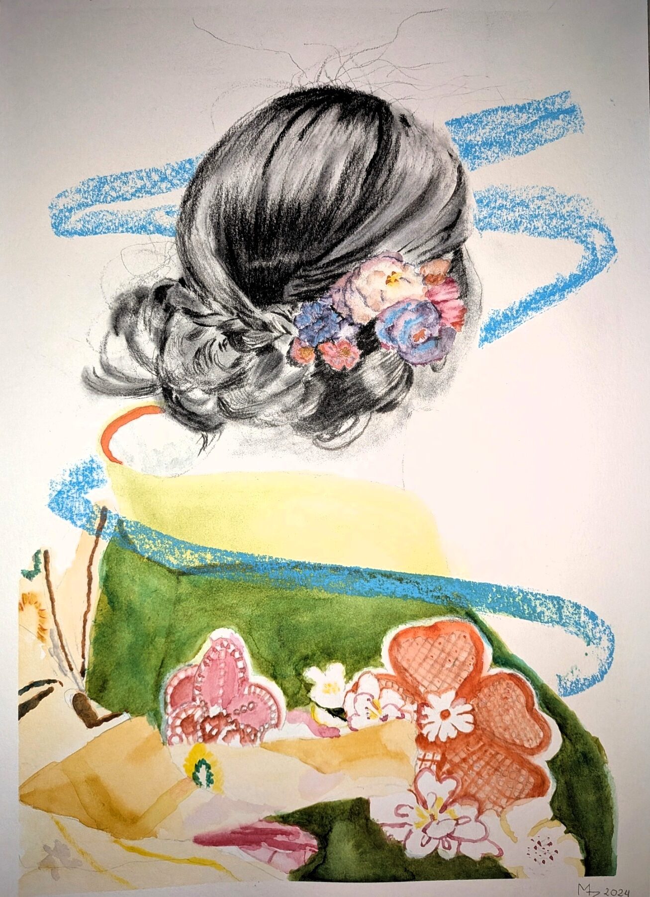 Mixed media. Teckning och akvarell målad på ett akvarellpapper av hög kvalité. Porträtt föreställande en kvinna i en japansk dräkt med blommor i håret. Arket är 28,5 x 41 cm, färgerna är Winsor & Newton Cotman. Teckningen är fixerad. Arket skickas med posten utan ram.