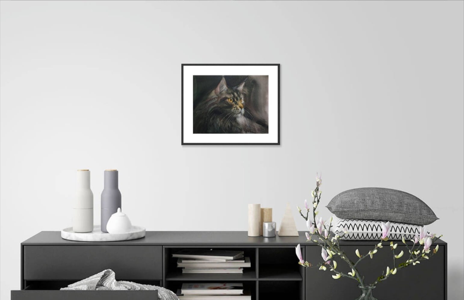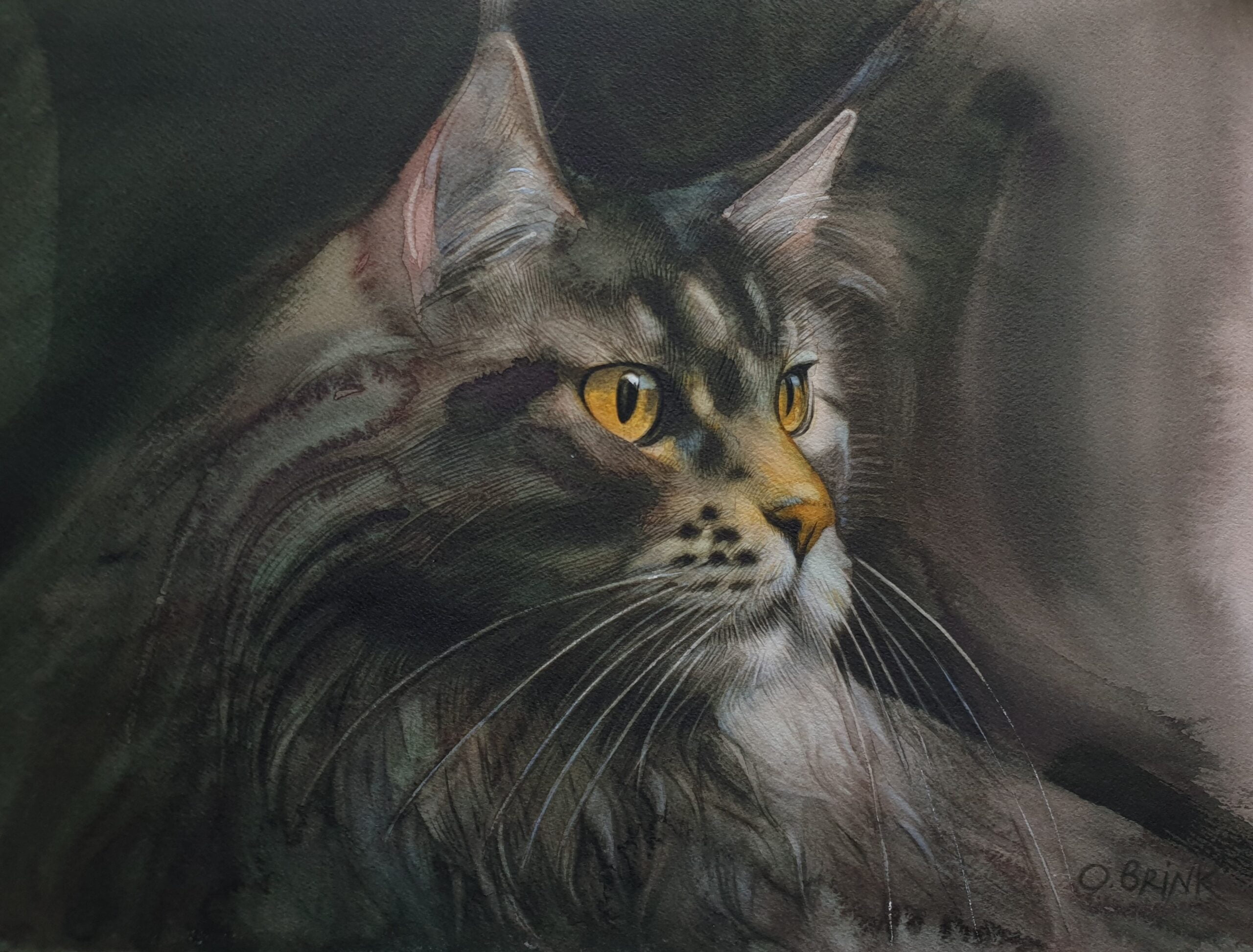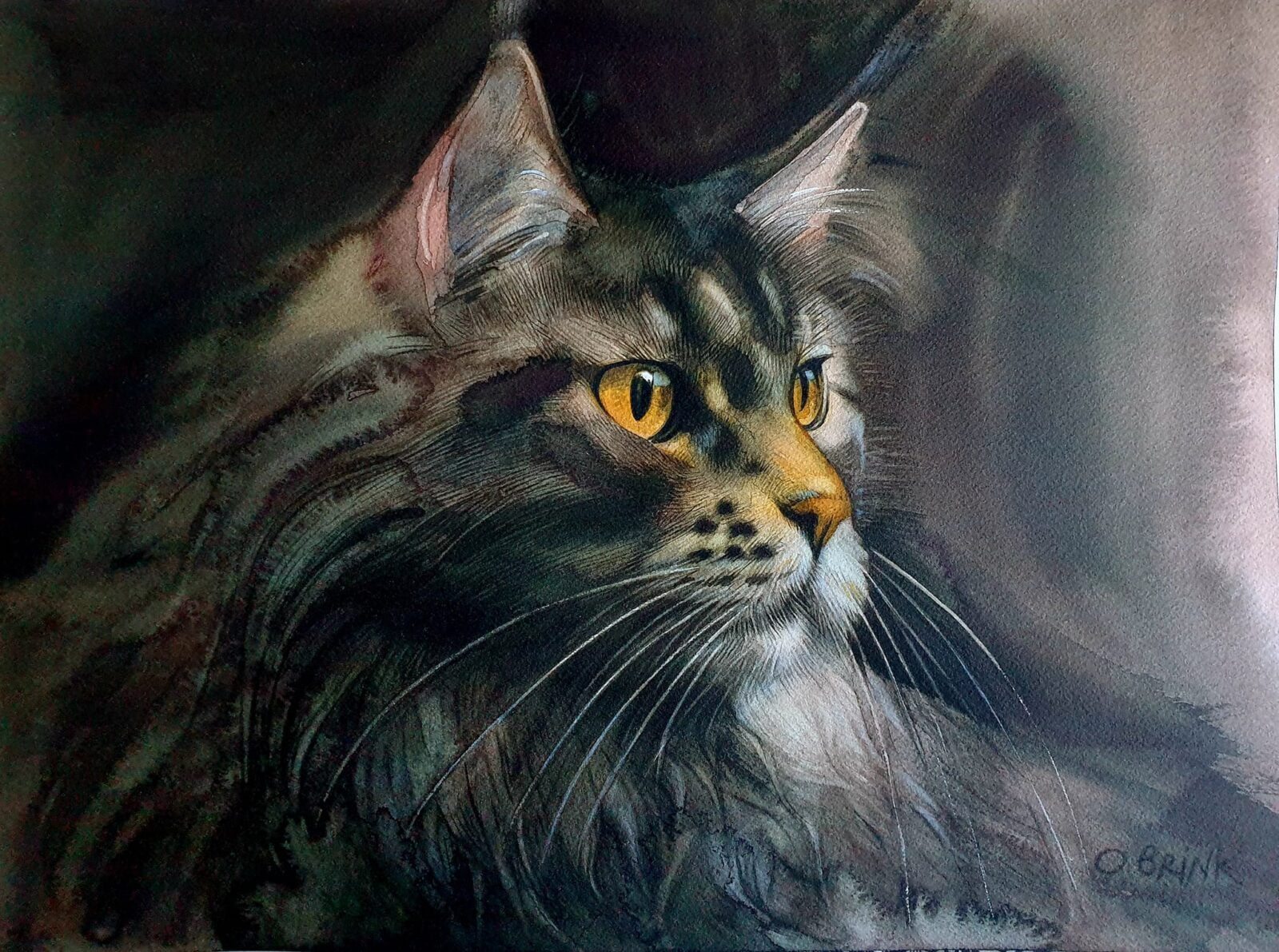 denna akvarellmålning fångar jag den majestätiska essensen av en Maine Coon-katt. Med en blandning av figurativa, impressionistiska och realistiska stilar var min avsikt att skildra den själfulla blicken och den invecklade pälsstrukturen som talar om visdom och lugn. De jordnära tonerna och mjuka nyanserna framkallar en lugnande men ändå pigg energi, som ger alla hem en känsla av frid och naturlig skönhet. Detta stycke erbjuder inte bara visuellt tilltal utan en känslomässig koppling till djurets fridfulla och ädla anda.