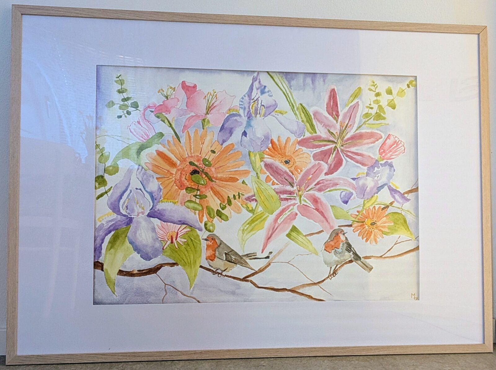 Vacker stor akvarell inspirerad av våren. Papper är av högsta kvalité av märke Saunders Waterford 425 g/m2. Färgerna är av märke Winsor & Newton samt Sennelier. Akvarellen föreställer är drömlik uppsättning av blomster. Storleken på akvarellen är 75 x 55 cm, och säljs inramad i en ram i nyansen ek, tillsammans med passepartout. Ramen är 70 cm x 100 cm stor.
