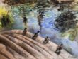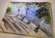 Målningen förmedlar en lugn, stämningsfull scen vid vattnet. I förgrunden leder stentrappor ner till ån, där fyra ankor putsar sig, återgivna med delikata penseldrag.